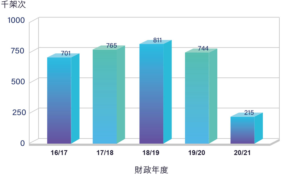 | 財政年度 | 航班總數 * | 升跌百分比 (比上年度) |